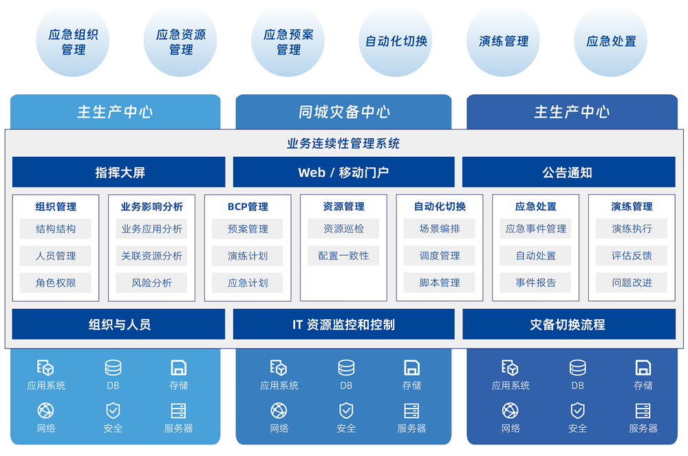 基于业务连续性全生命周期管理的设计理念,,,,采用一体化的技术管理平台,,,,将风险分析、、、、业务影响度分析、、、、预案开发和管理、、、、应急演练、、、应急响应、、、、应急恢复等业务连续性相关工作全面覆盖,,,,帮助企业实现数字化的预案建模、、资源实例化、、、预案演练、、预案自动化执行、、、审计改进等各环节的闭环管理。。。。