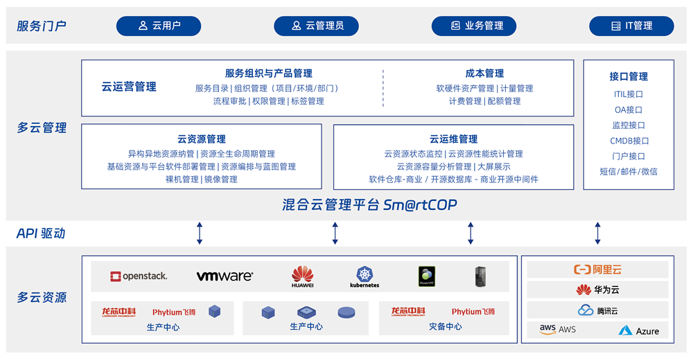 面向各行业用户多云资源管理、、、、运维及服务提供的综合挑战,,,,提供异构异地异芯片多云资源的统一管理、、、统一运维、、统一监控及统一运营服务,,简化多云管理复杂度,,,,提升用户用云满意度,,释放云平台业务价值。。